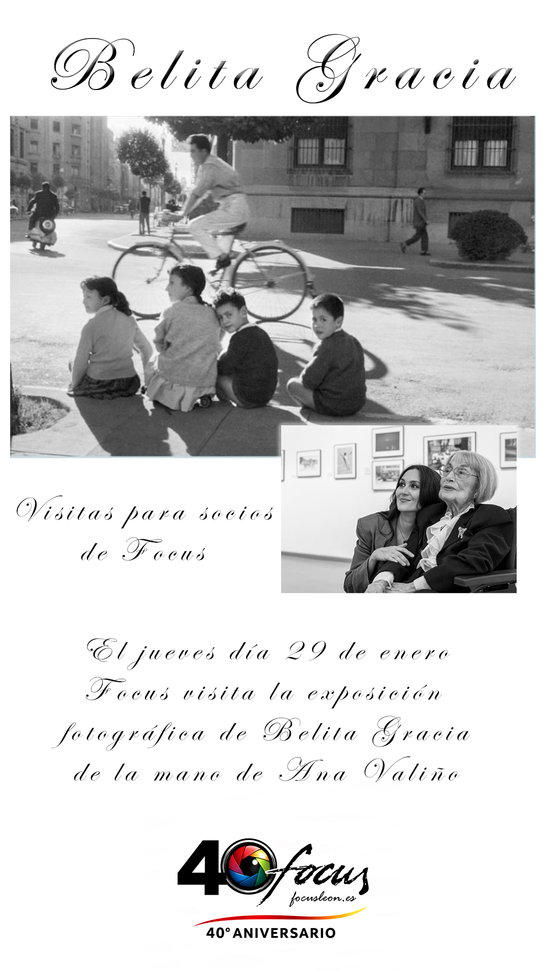 Comenzamos nuestro 40 aniversario con una actividad para socios de Focus. El día 29 de enero de 2026 podremos disfrutar de una visita guiada, de la mano de la comisaria de la exposición Ana Valiño, a la exposición de la gran fotógrafa leonesa Belita Gracia.